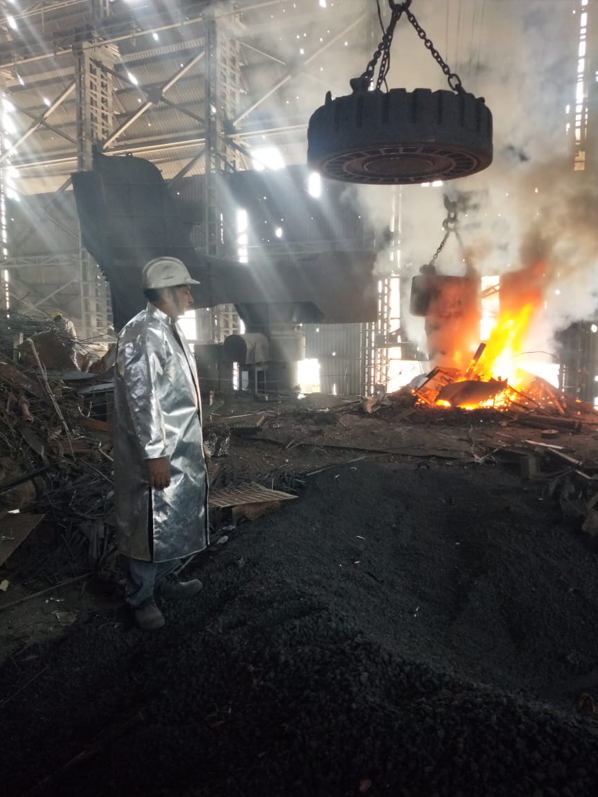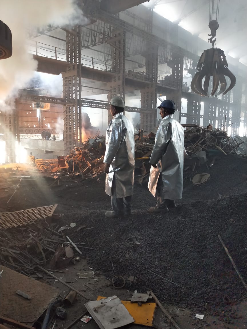 The pictures below show a metal factory in Maharashtra, India melting heavy loads of scrap metal in their smelter pit with workers closely inspecting the process.